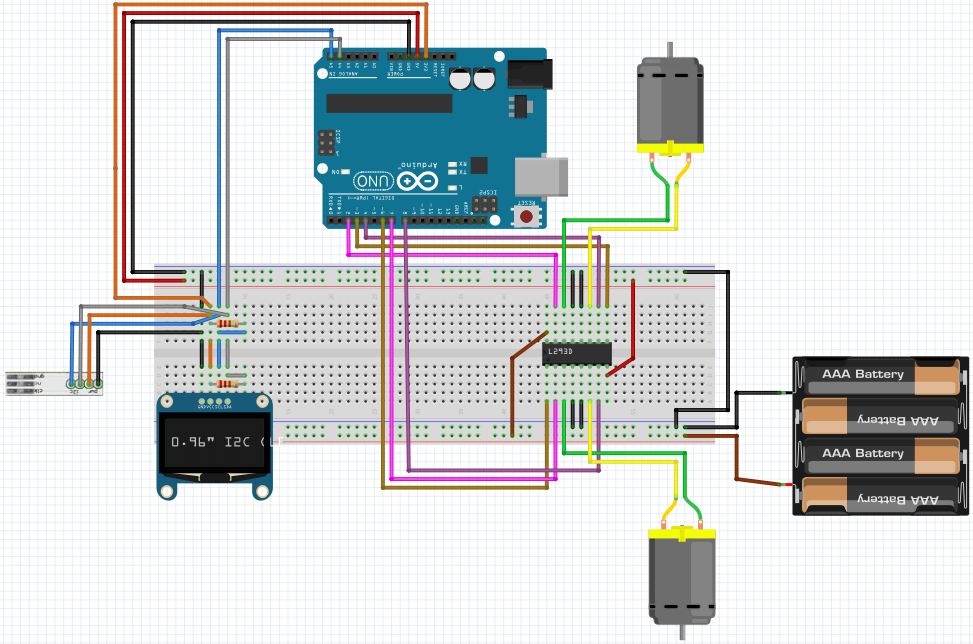 Ho collegato uno dei due motori al lato sinistro del chip (pin 3 e 6) e l’altro al lato destro (pin 11 e 12).