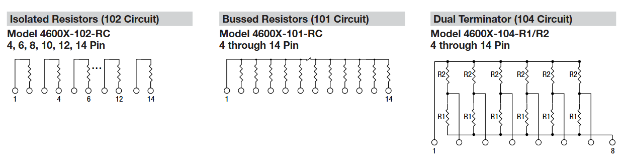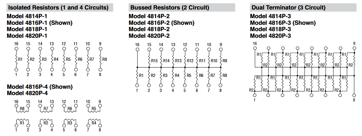 I Resistor Array, o Resarray per gli amici, sono dei componenti mono o bifilari che contengono multipli resistori con collegamenti vari, come ad esempio, dal datasheet di resarray della Bourns: