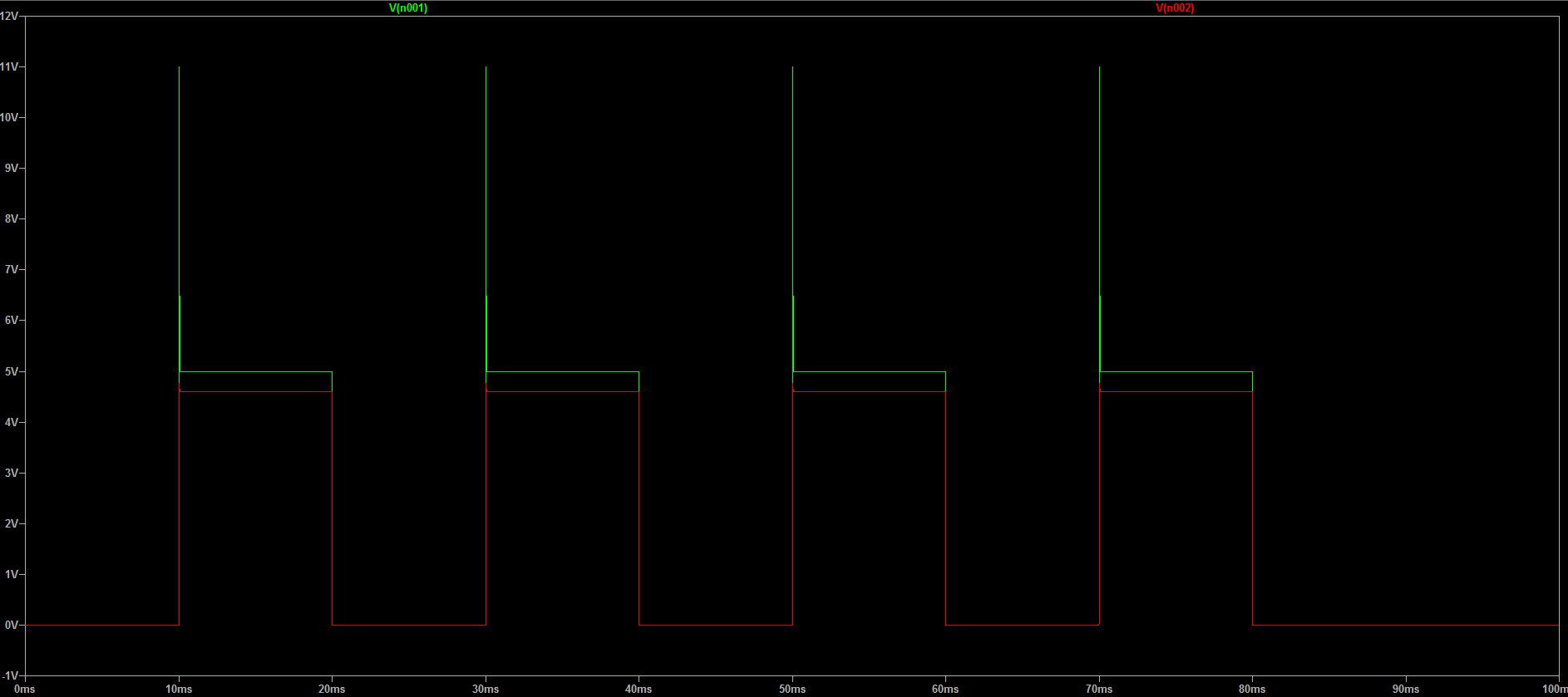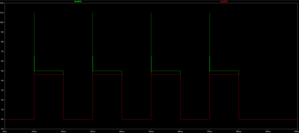 usando lo stesso esempio di onda quadra “sporca” che abbiamo ripulito in precedenza con un condensatore, con un grosso picco sul fronte crescente: