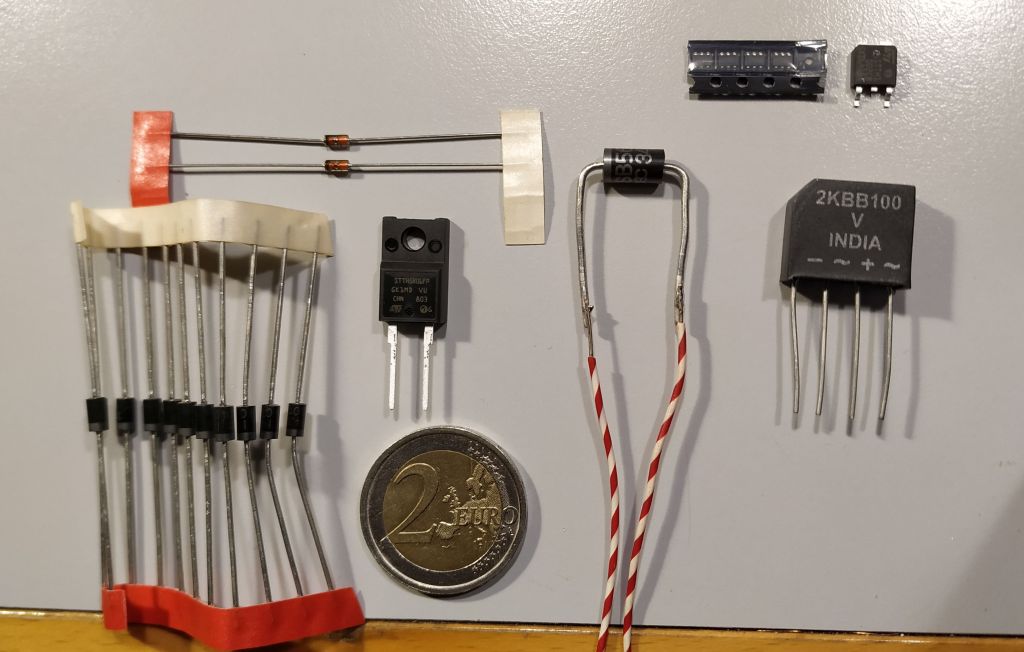in alto, in formato SMD: a sinistra una striscia di quad TVSD (vedi descrizione più avanti), che include una batteria di 4 diodi della varietà TVSD per protezione circuiti in unico package; a destra, un doppio diodo di potenza a Catodo comune; questo formato permette di avere due diodi con Anodo indipendente, per particolari usi in fase di progettazione.