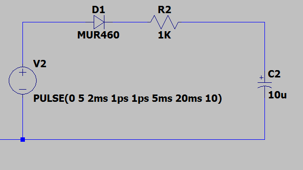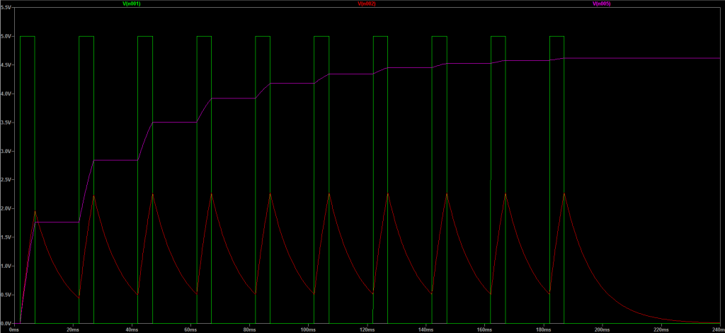 Violetto: con diodo: la caduta di tensione del diodo si fa notare a primo ciclo, ma si vede anche che, una volta acquisita una tensione, il condensatore non si scarica e al successivo impulso si riparte da lì. Inoltre, quando gli impulsi smettono, mantiene la tensione raggiunta; al contario, il condensatore senza diodo si scarica fino a zero. In questo esempio ipotetico, è ciò che volevamo ottenere.