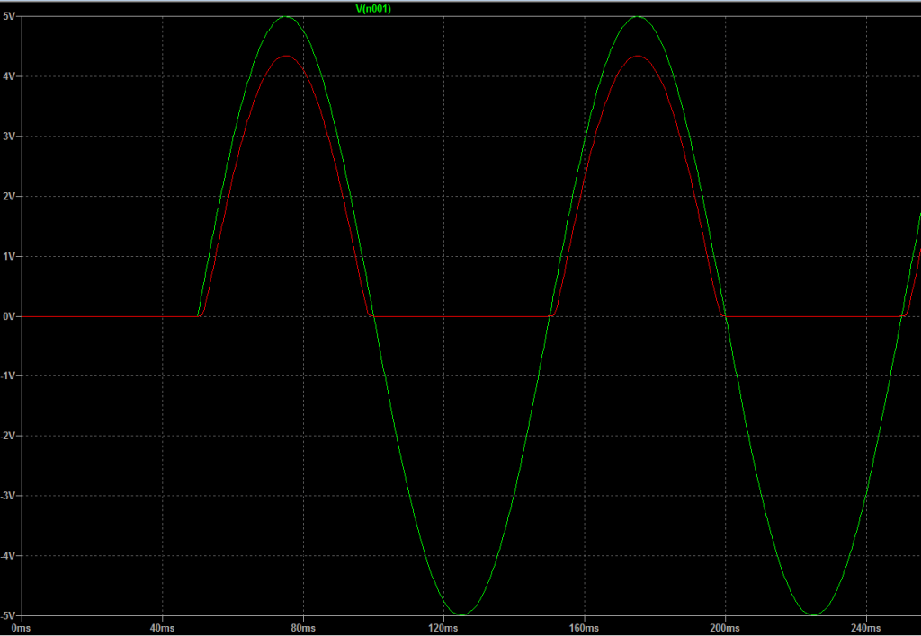 Per i diodi in silicio, che sono tra i primi e i più diffusi, tipicamente la caduta di tensione è di 0.6-0.7V che non è indifferente quando si parla di basse tensioni; per fare un esempio, questo è l’effetto quando si cerca di far transitare una sinusoide attraverso un diodo in silicio: