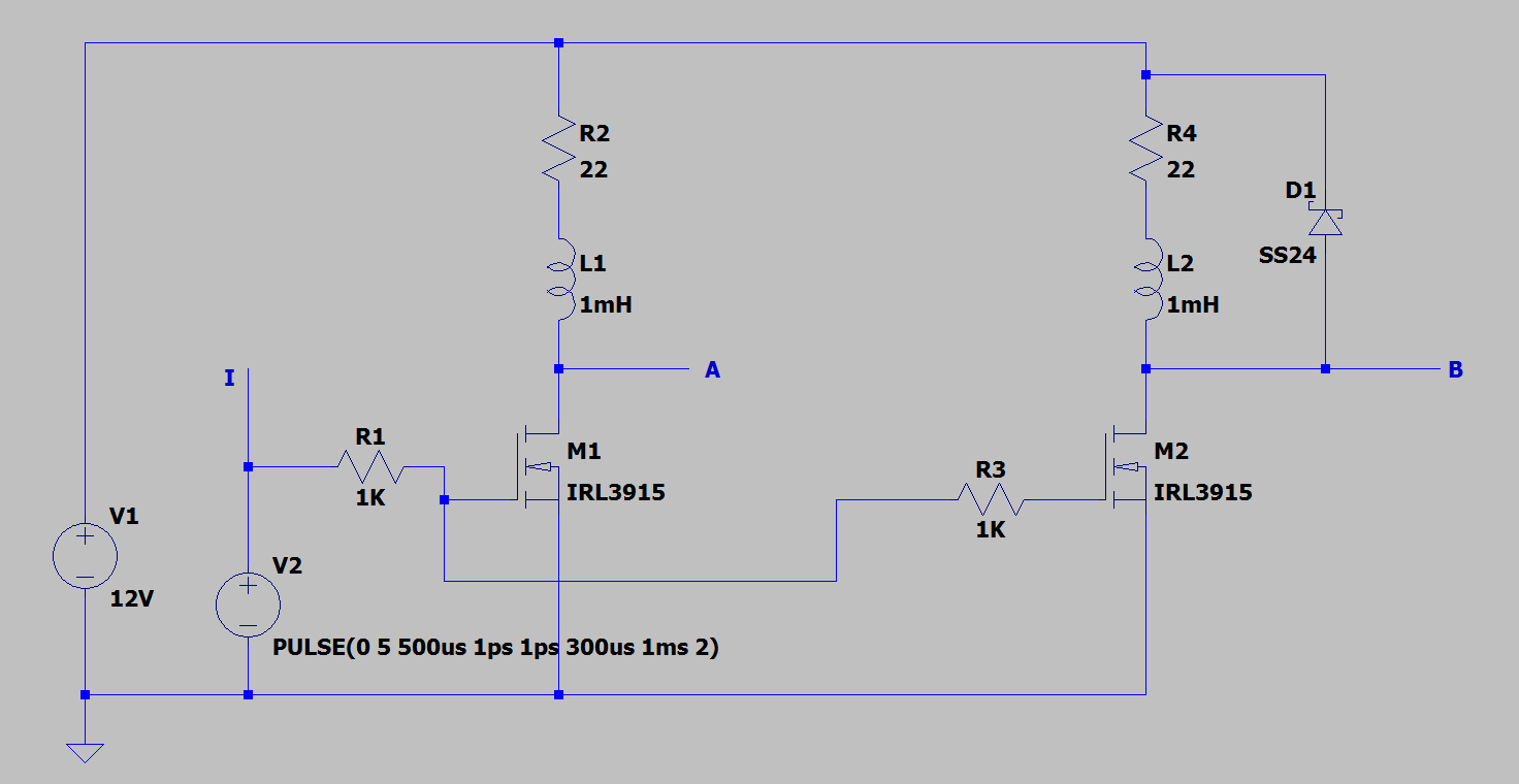 La parte destra contiene lo stesso circuito (che sfrutta lo stesso impulso), ma con un componente in più: uno Schottky.