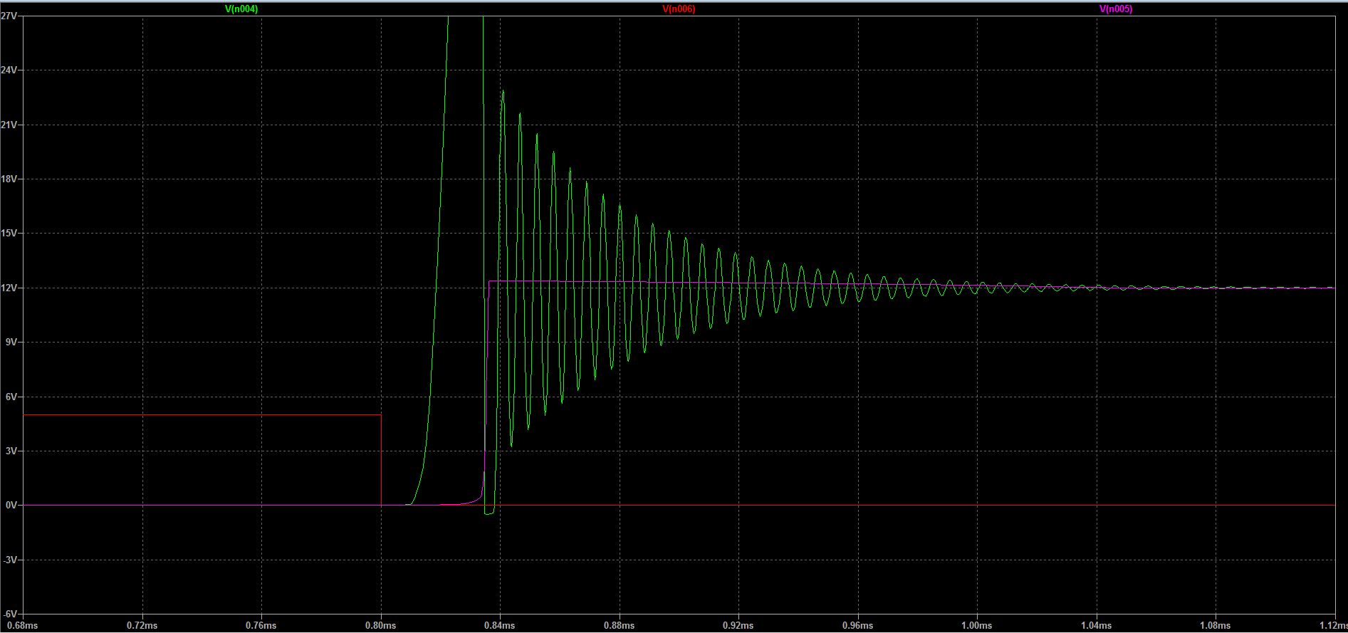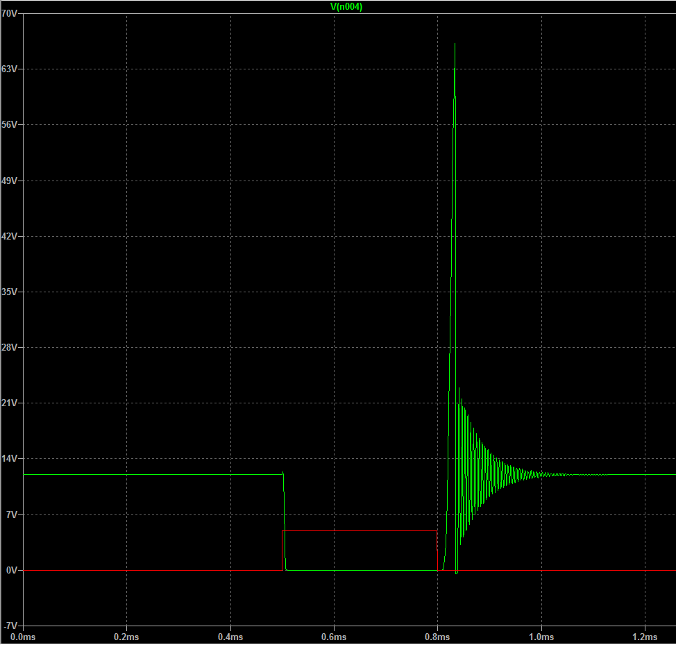 0.5ms: arriva l’impulso che chiude l’interruttore: la tensione su A va a GND (0V), la corrente inizia a fluire, tutto regolare. Dopo 300us l’impulso cessa, il circuito si apre, ed è qui che si verifica l’orrore: una punta di tensione a 66V circa, quindi un bell’accrocchio di roba che vediamo qui in dettaglio: