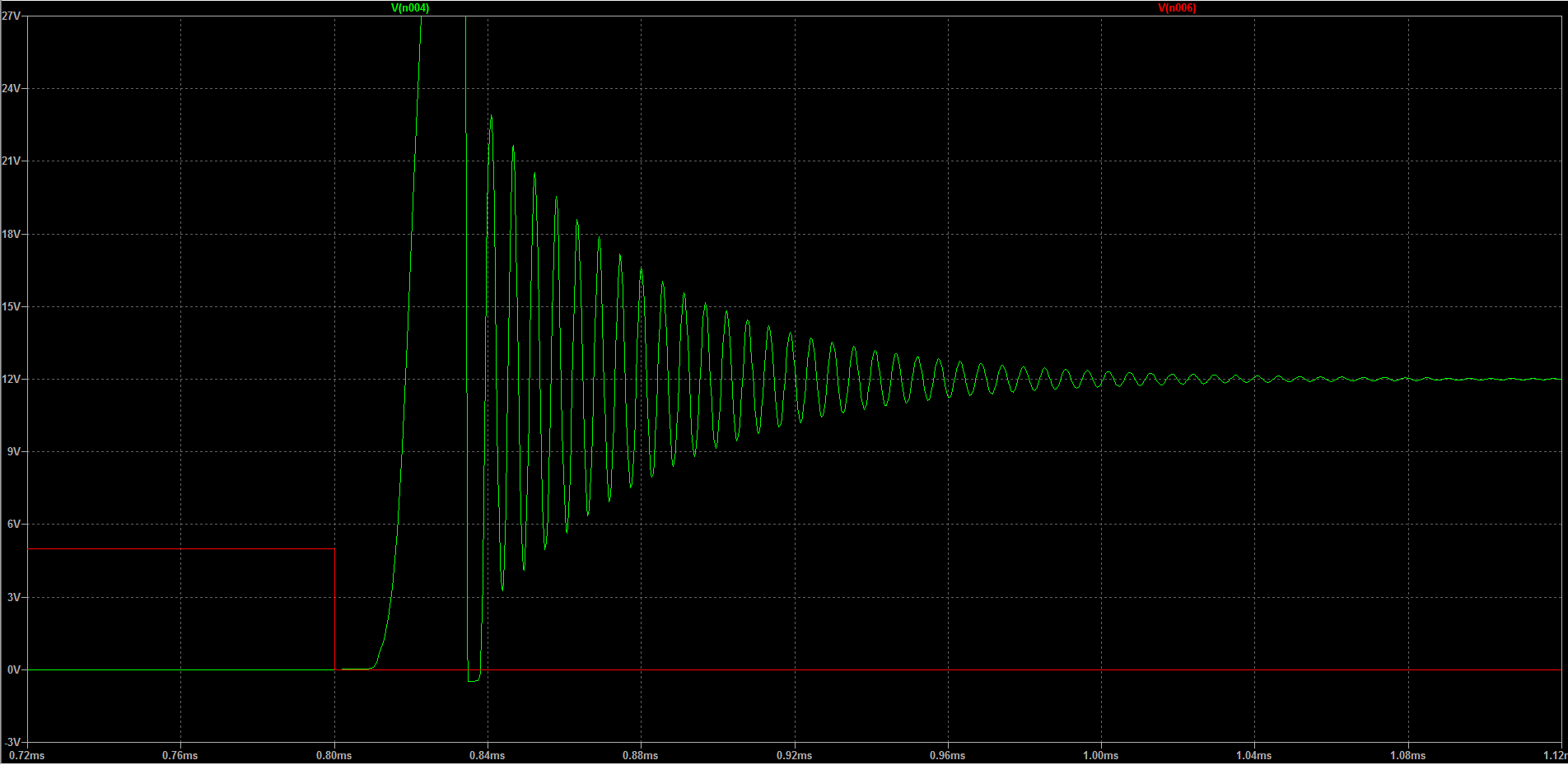 Poi abbiamo una oscillazione spontanea che si smorza da sola nel tempo, ma che inizia con un picco da 23-24V, sempre più debole, fino a riassorbirsi.