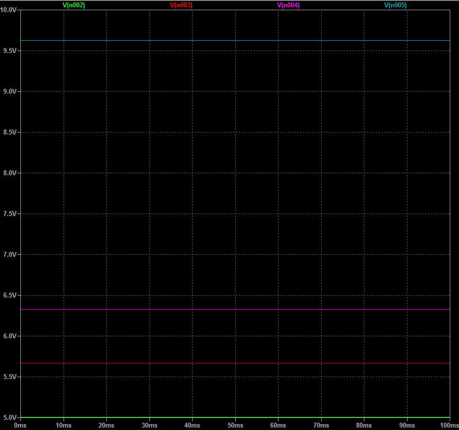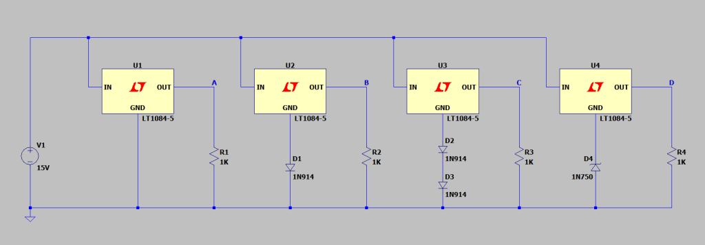 Ma se ci serve una tensione leggermente diversa e non esiste il 78xx del valore giusto? Trampellando con dei diodi possiamo avvicinarci al valore che ci interessa; prendiamo questo circuito che ho disegnato per fare la comparazione; c’è una tensione di ingresso di 15V e 4 regolatori LT1084-5 che sono equivalenti al 7805.