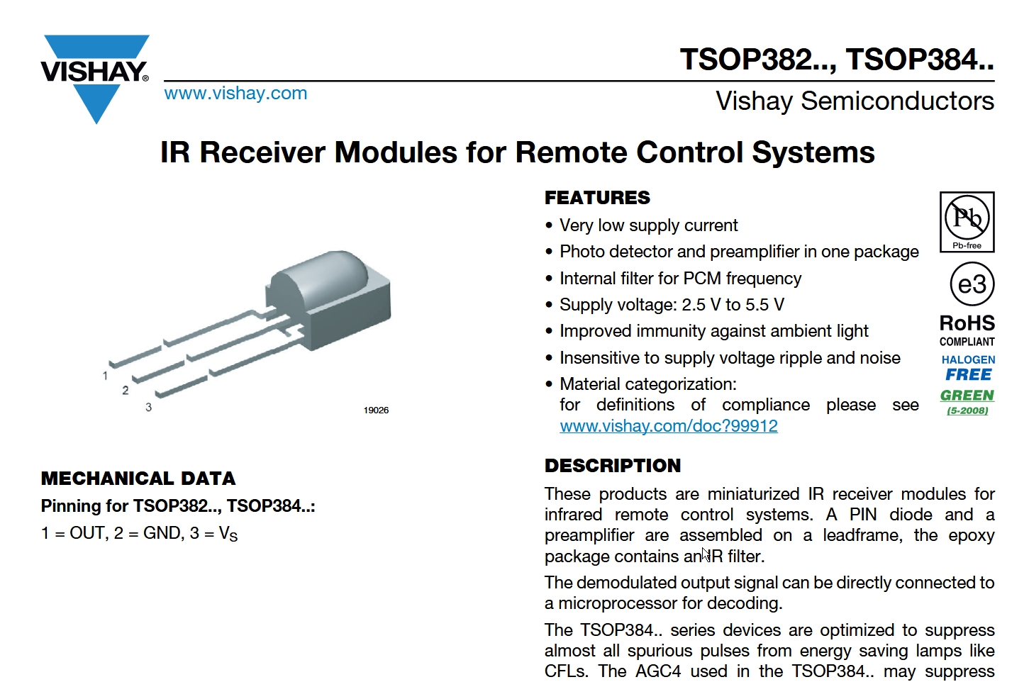 Il sensore TSOP38238 (l’ultimo 38 sta per la frequenza della portante) è un gioiellino, in quanto risparmia al progettista lo strazio di dover controllare la frequenza della portante, filtrare disturbi logici (impulsi spurii) o fisici (raggi infrarossi di diverse lunghezze d’onda). Lui riceve, e se riconosce la portante butta fuori un segnale pulito, ovvero gli impulsi già raffinati.